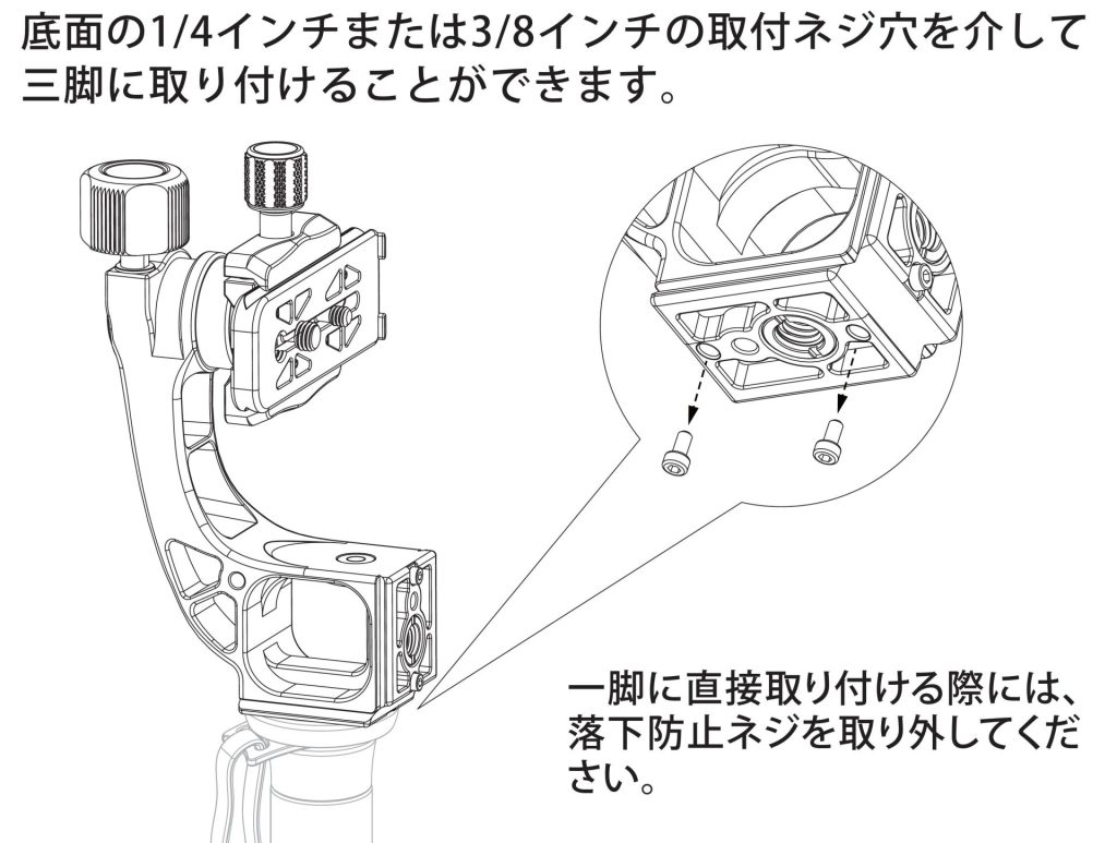 1/4,3/8インチネジとアルカスイス規格による雲台取付が可能。雲台に取り付ける事により、左右のパンニングが可能となり、三脚での使用も快適に操作が出来ます。